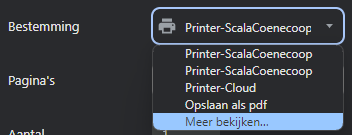 - Staat de printer er niet bij? Klik dan bij bestemming en daarna op "Meer bekijken". Selecteer daarna Printer-ScalaCoenecoop