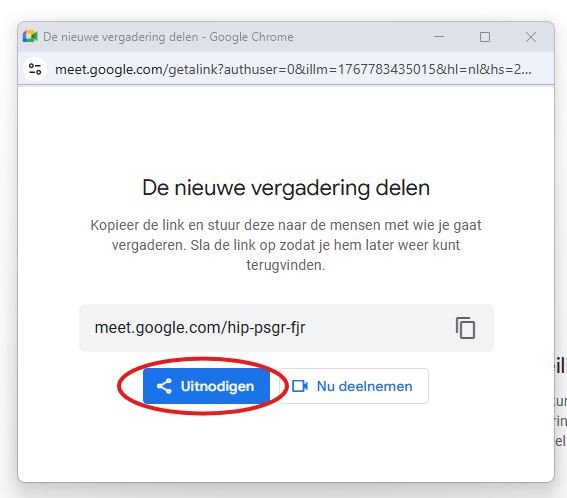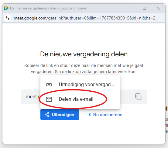 - Je krijgt nu een venster te zien met twee opties. Kopieer de meet link zodat je die straks in de browser kan plakken om zelf ook deel te kunnen nemen in de meet.