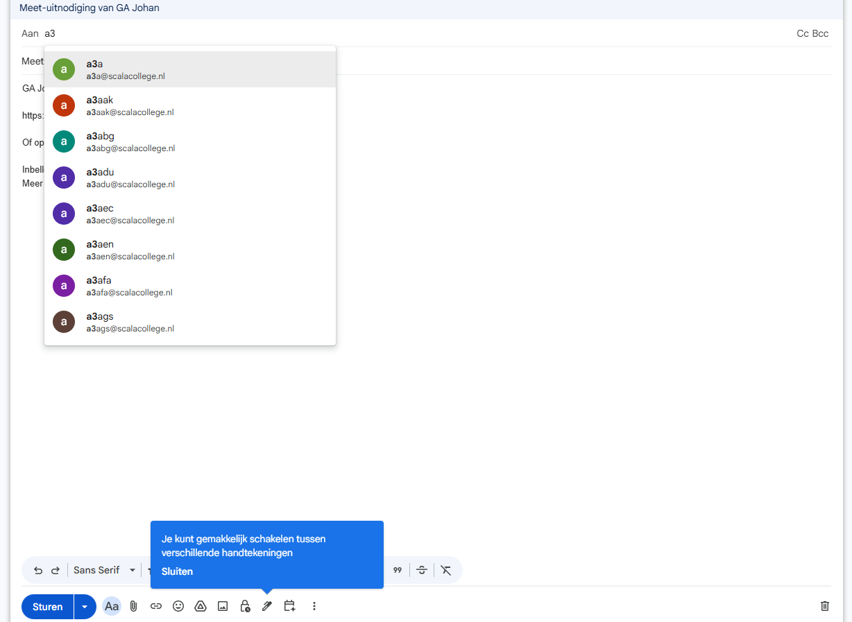 - Er verschijnt een e-mail scherm. Vul bij aan je lesgroep in waar je online les aan wil geven. Klik versturen