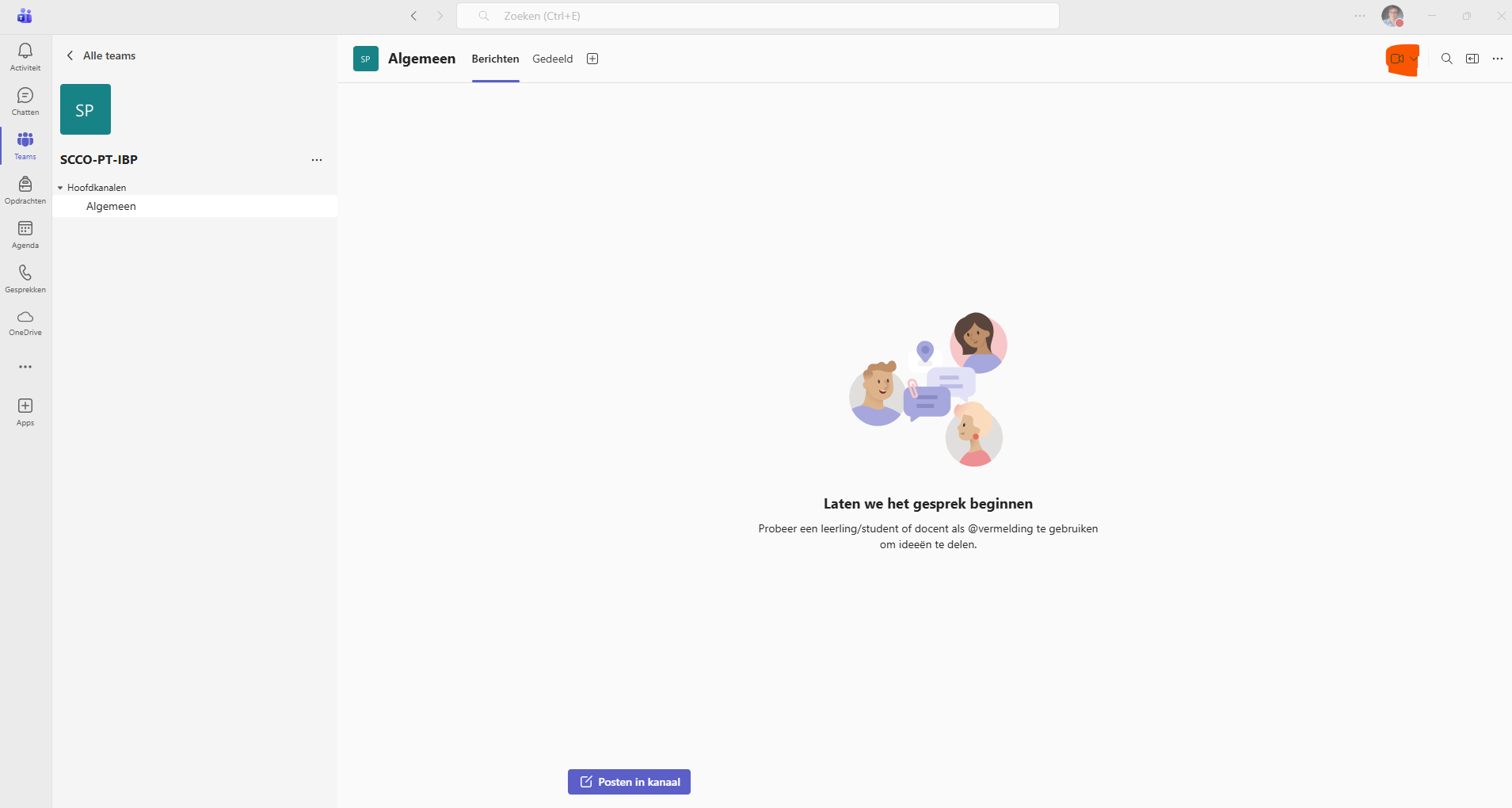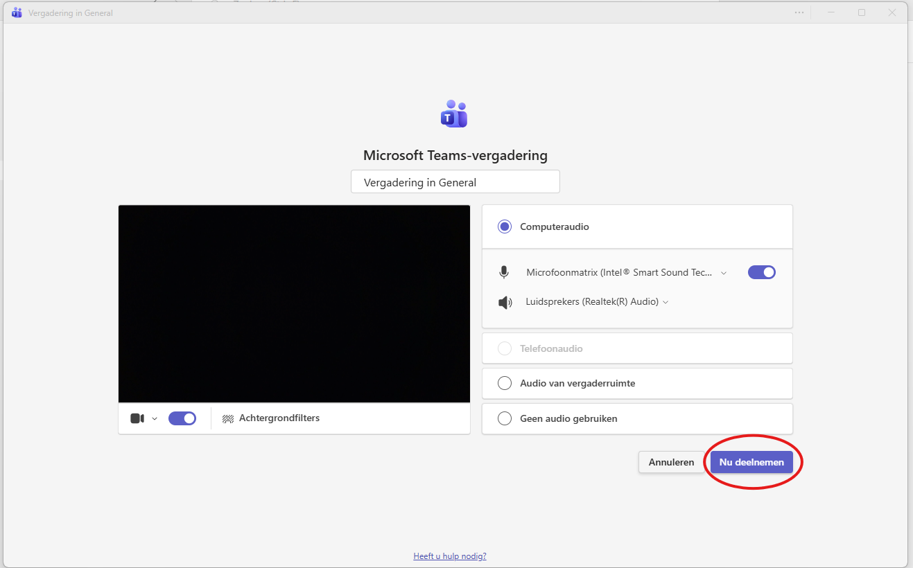 - Klik op Nu deelnemen. Er verschijnt nu een melding in het kanaal, zodat anderen op 'Deelnemen' kunnen klikken.